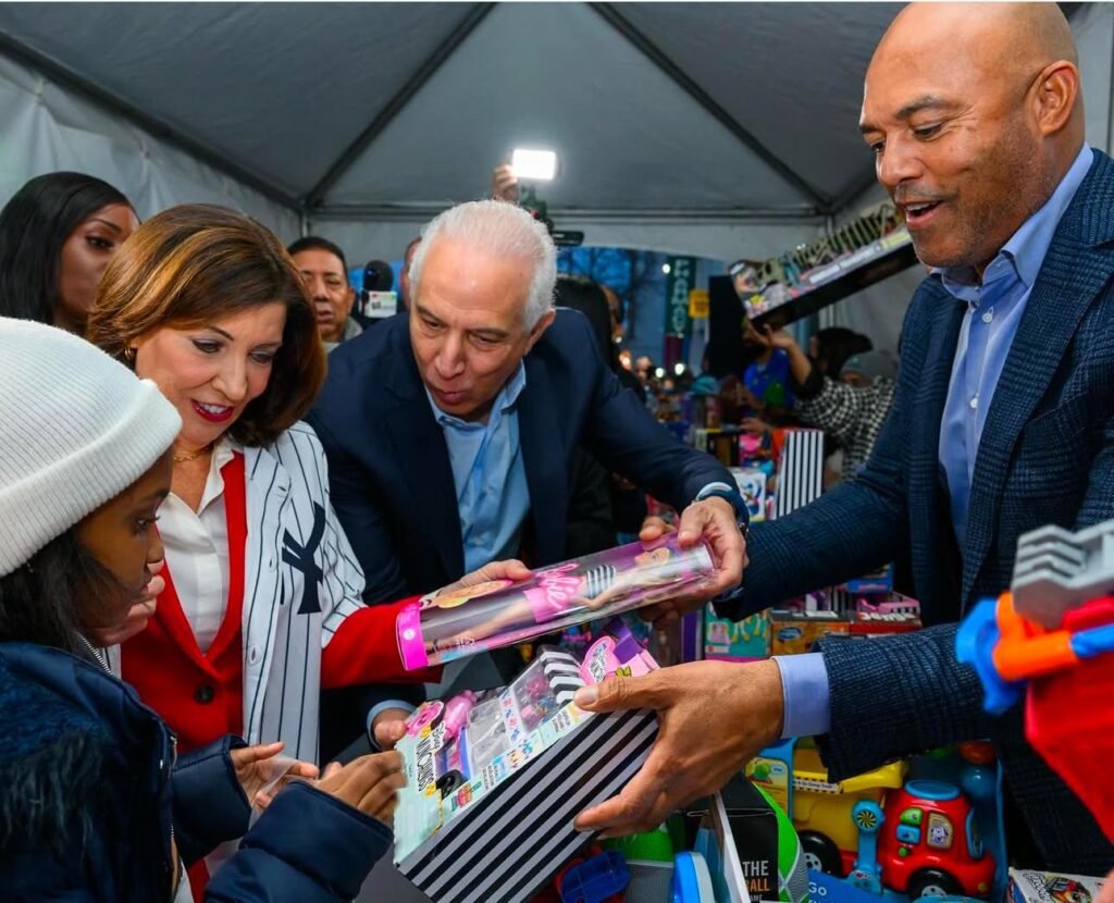 NUEVA YORK.- Kathy Hochul, gobernadora del estado de Nueva York, Mariano Rivera, primer beisbolista en la historia inmortalizado al Salón de la Fama en Cooperstown por votación unánime y Vanessa L. Gibson, presidenta del condado de El Bronx, acompañaron al doctor Ramón Tallaj, Chairman of the Board, SOMOS Community Care, a la continuación del operativo navideño con la entrega de juguetes a niños esta vez en El Bronx, (Boston Road Medical Center), reunidos gracias a la grandeza del corazón gigante de Tallaj.