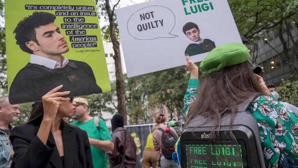 Desde su detención, Mangione ha generado un movimiento de seguidores que critican el sistema de aseguradoras médicas. Afuera del tribunal, decenas de personas portaban pancartas con lemas como «La salud antes que la riqueza», y algunos vestían disfraces de Luigi.